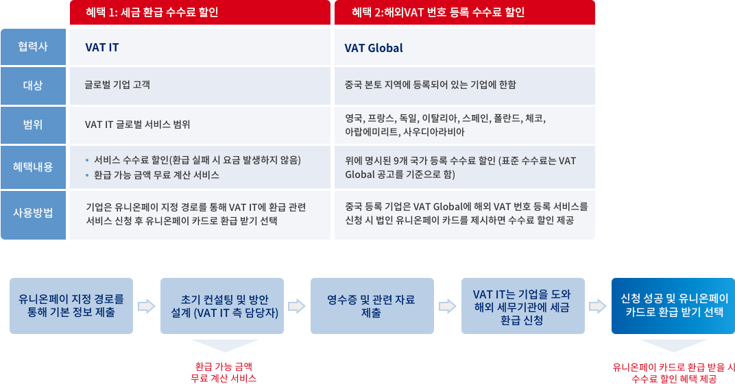 유니온페이 인터내셔날은 VAT IT와의 협력을 통해 기업에게 해외 VAT 환급 솔루션을 제공하며 해외 사업 개발 비용을 절감하고 세금 환급 수익을 극대화할 수 있도록 합니다.