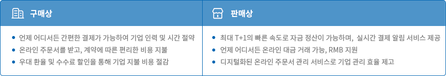 전 세계 구매상 및 판매상을 위한 연동 플랫폼 및 안전한 부가가치 서비스를 제공하여 B2B Cross-border 결제를 더욱 편리하게 만들었습니다.